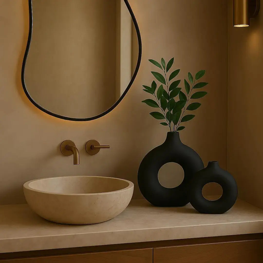 O design em formato donut cria um efeito decorativo marcante, adicionando leveza e modernidade ao ambiente. Por serem feitos à mão em gesso e cimento, cada peça é única, com textura elegante e alta resistência.