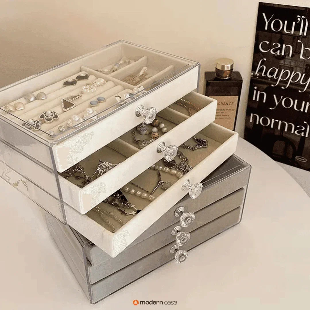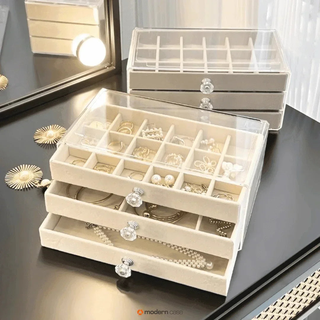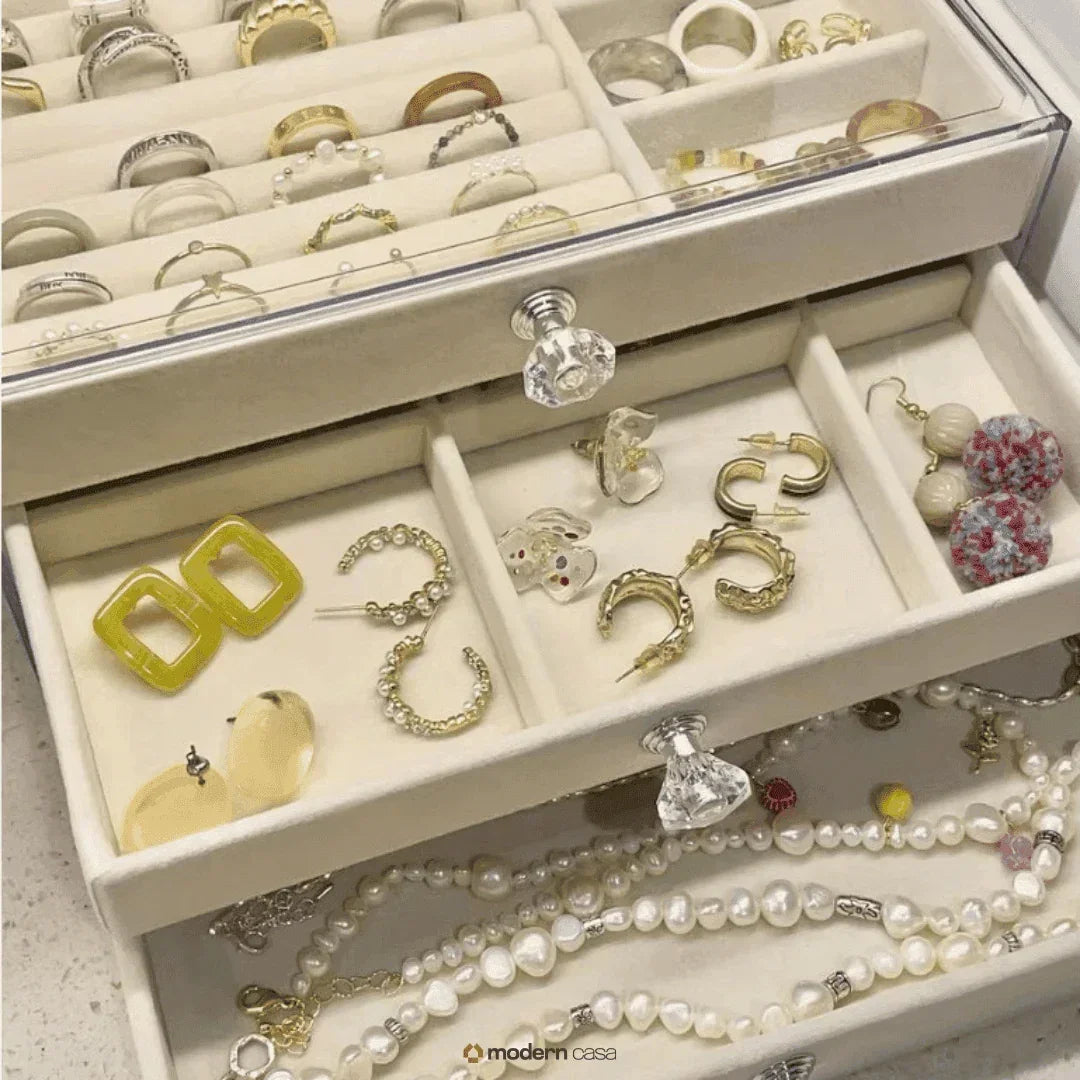 Este organizador de joias com acabamento premium em veludo e acrílico é ideal para quem busca funcionalidade sem abrir a mão do estilo.