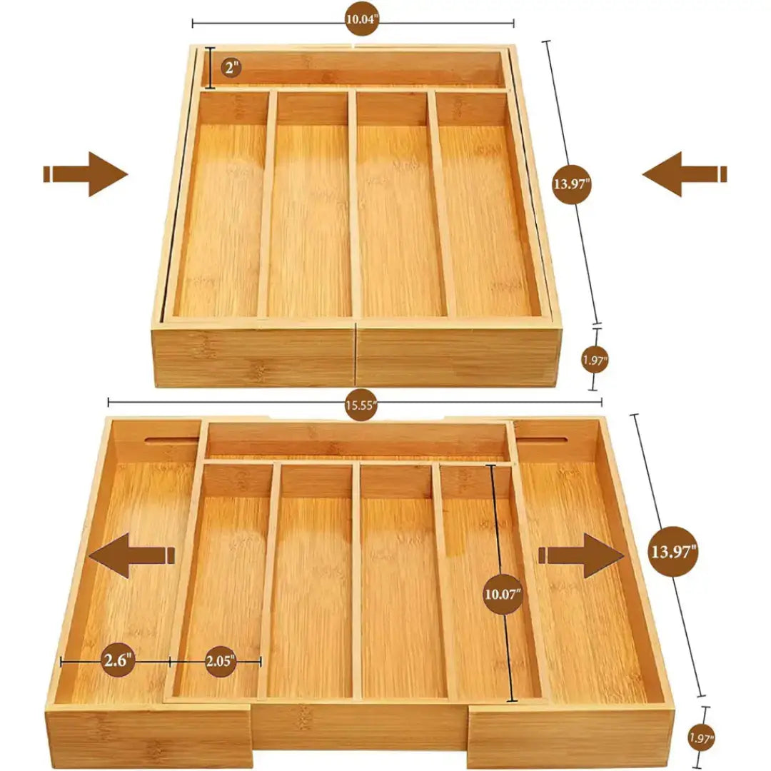 Feito em bambu natural de alta qualidade, o organizador combina durabilidade, resistência e um visual sofisticado que valoriza o ambiente. Seu design extensível permite ajustar o tamanho conforme o espaço da gaveta, garantindo encaixe perfeito e aproveitamento máximo.