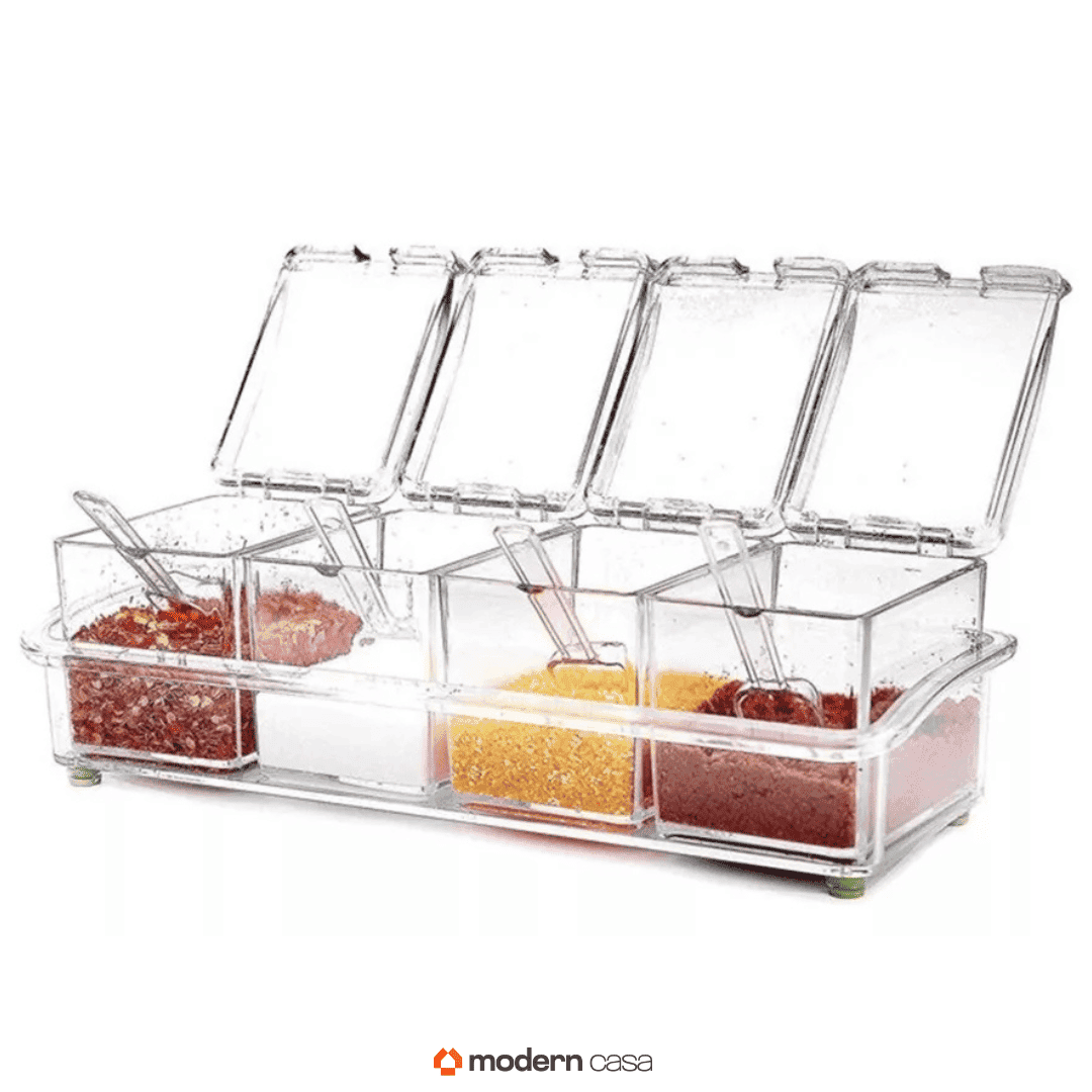Com design compacto e moderno, o organizador possui 4 potes individuais com colheres exclusivas, permitindo armazenar seus temperos favoritos de forma higiênica e prática.