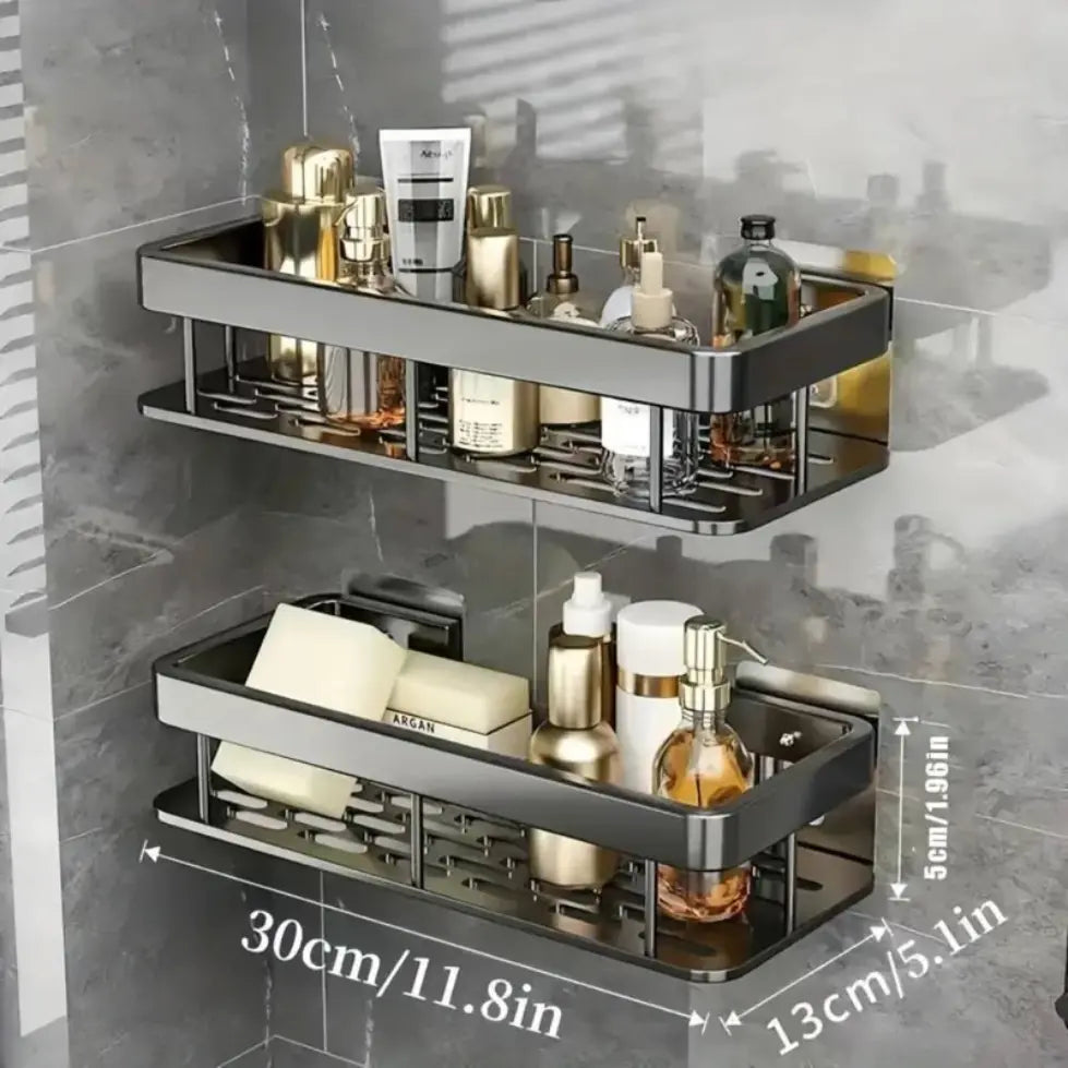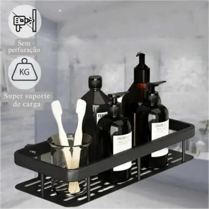 O suporte conta com espaço ideal para shampoo, condicionador, sabonete e itens de uso diário, mantendo tudo visível e fácil de acesso.